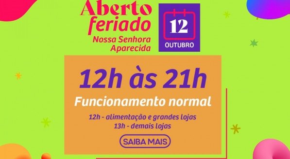 Nesse feriado de 12 de outubro, Nossa Senhora da Aparecida, o Salvador Shopping funcionará normalmente, das 12h às 21h, com todas as operações abertas ao público.